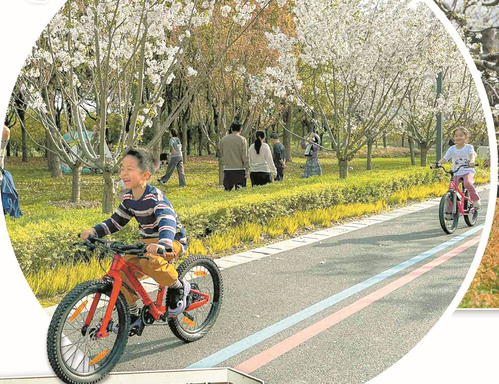 浦东新区康桥镇的汤巷公园内,一公里的樱花大道迎来盛花期,孩子们尽情享受春日骑行快乐。本报记者 陈龙摄
