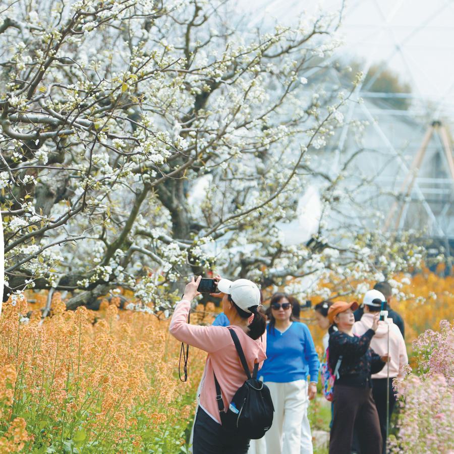 嘉定区华亭镇以“田园花海 诗意亭浏”为主题的愚农庄园梨花节如约启幕,游客在这片千亩梨园中驻足赏花。本报记者 赵立荣摄